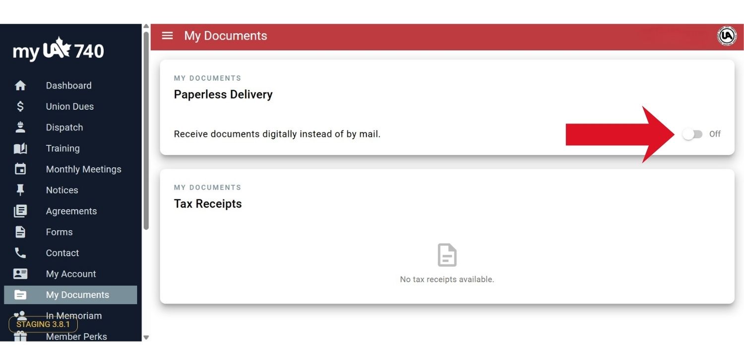 When you sign up to go paperless, each time a new document is ready for you to view, you will receive an email notifying you of the document. For Dues Payments and Monthly Statements, these will be sent to your email account. For Union Dues Tax Receipts, you will receive an email directing you to log into your account to access it. Union dues tax receipts will be placed in the ‘My Documents’ section of your MyUA740 website for you to retrieve.
